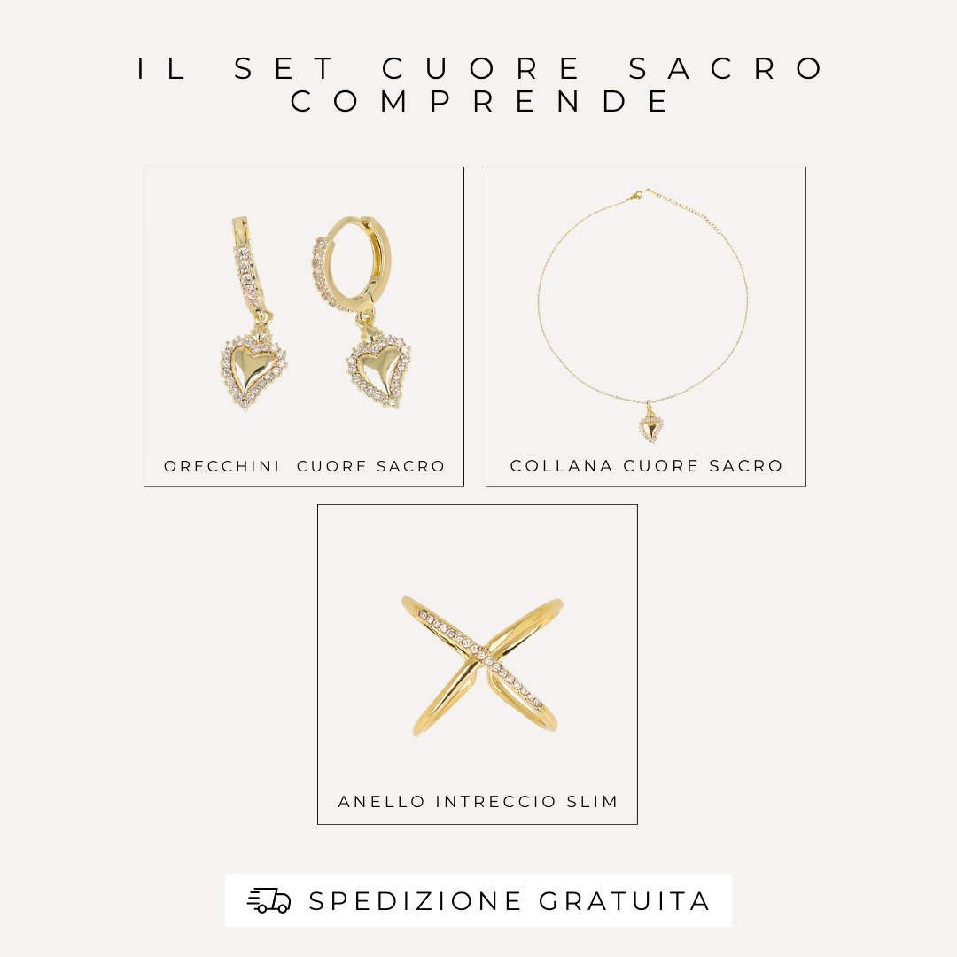 x1 Paio di Orecchini CuoreSacro, x1 Collana CuoreSacro, x1 Anello Intreccio Slim.